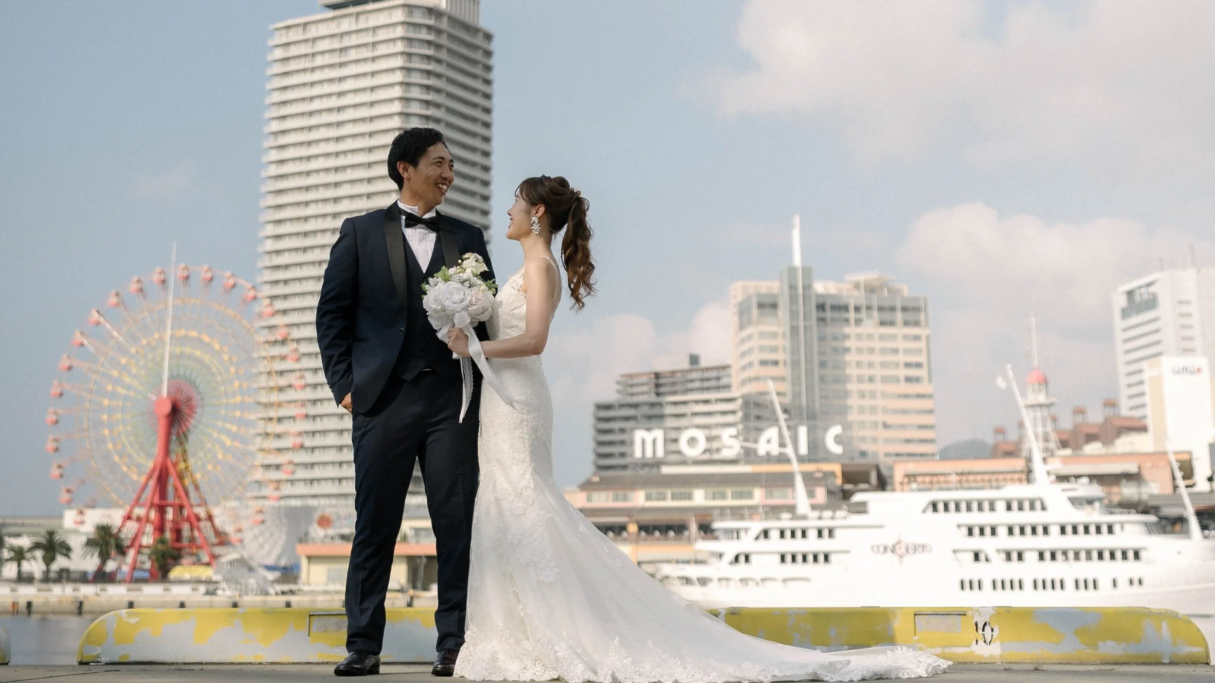 撮影当日は、プロのヘアメイクスタッフによるフルサポート付き。事前のご相談内容に基づき、お支度場所の手配から当日のスタイリングまで丁寧に対応いたします。また、撮影中もスタッフが同行し、髪型やメイクの崩れをチェック・お直ししながら進行します。小物の調整やポージングの補助なども行うため、写真写りの不安も安心に変わります。「ふたりが撮影に集中して楽しめる」よう、終日しっかりアテンドいたします。